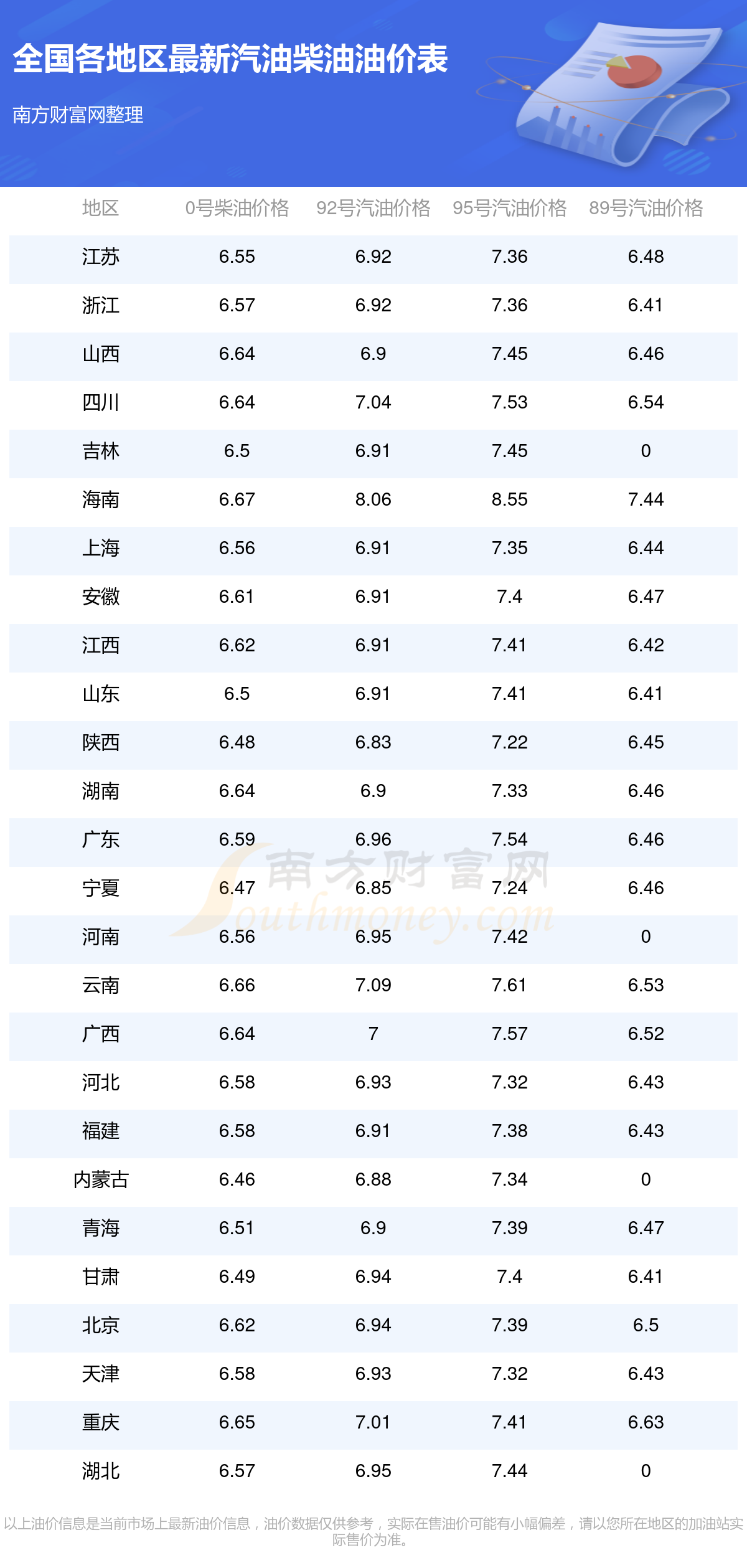 以上油价信息是当前市场上最新油价信息,油价数据仅供参考,实际在售油价可能有小幅偏差,请以您所在地区的加油站实际售价为准。