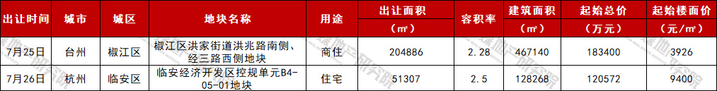 本周杭州临安区青山湖科技城将在7月26日出让1宗宅地;嘉台州在7月25日出让一宗商贸中心区的商住地。