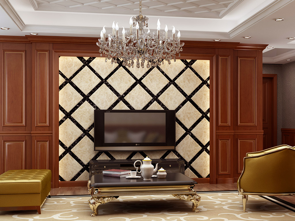 首要带来的第一款木纹墙面装饰效果图,开放式的空间,着重空间的通透感,电视机的背景墙运用木纹铺贴,调配大理石瓷砖,创造出墙面的立体层次。调配金属的皮质沙发和同色系地毯,营建更精美舒适的居家气氛。